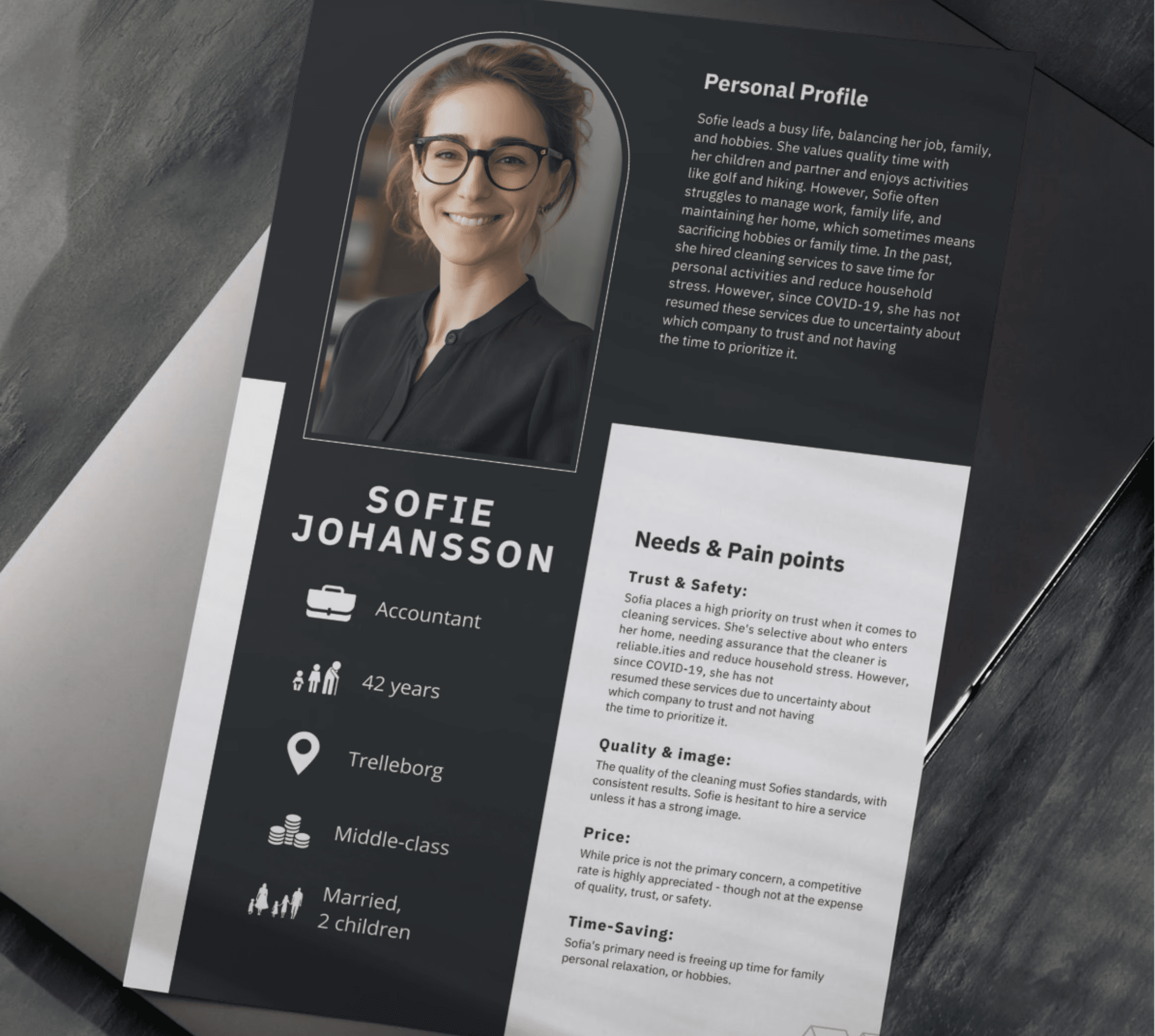 Based on the research, a persona was developed to represent a typical user - a busy, budget-conscious customer who values time, reliability, and professional cleaning at an affordable price. The persona served as a key reference point, helping align the team and guide design and communication decisions throughout the project.