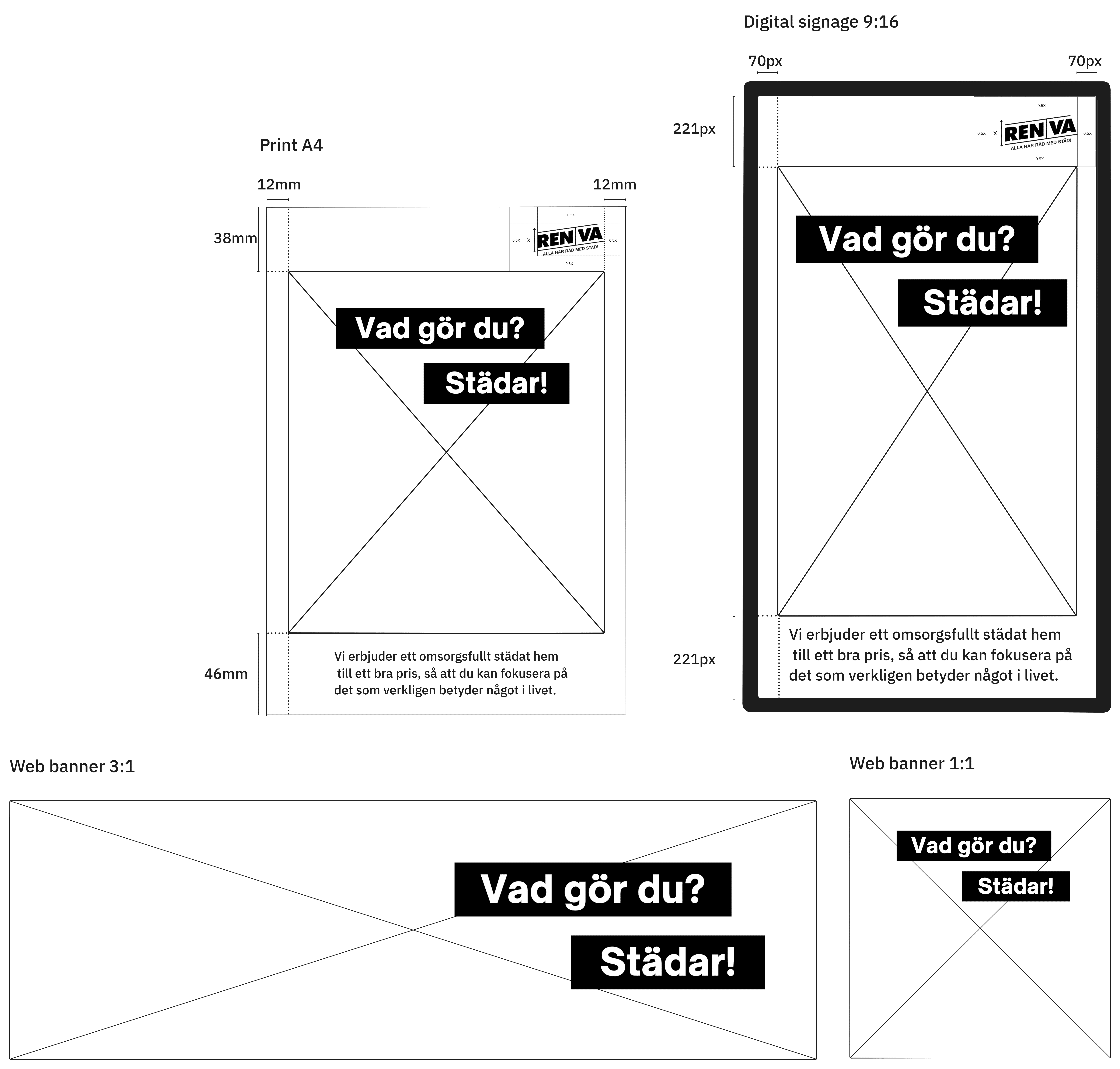 The layout for web, print, and digital signage was defined with a focus on maximizing image size and maintaining optical balance. Design elements like margins and alignment were refined to match RENVA’s visual identity. Custom banners and message bubbles were developed to present key messages as a conversation. Sharp corners and a black color scheme were chosen for consistency and a sleek, professional look.